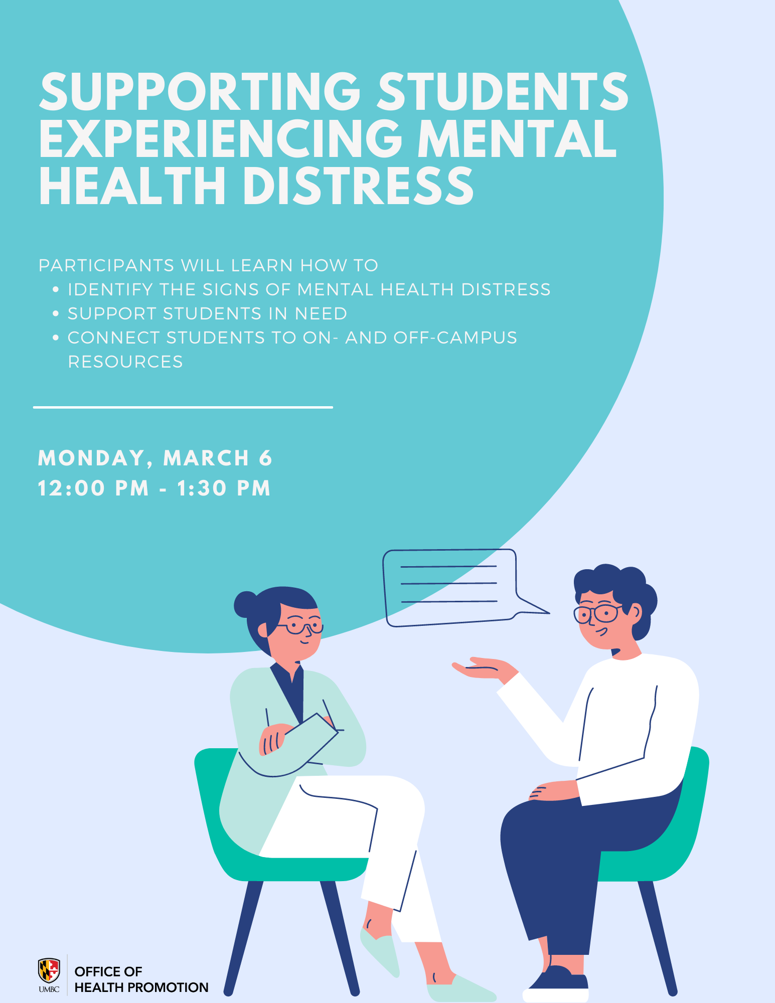 Join the Office of Health Promotion as we host a virtual workshop to help you identify the signs of mental health distress, provide strategies to support students in need, and connect students to available on-campus and off-campus resources. Participants will be able to ask questions and apply their knowledge during our breakout sessions near the end of the workshop.