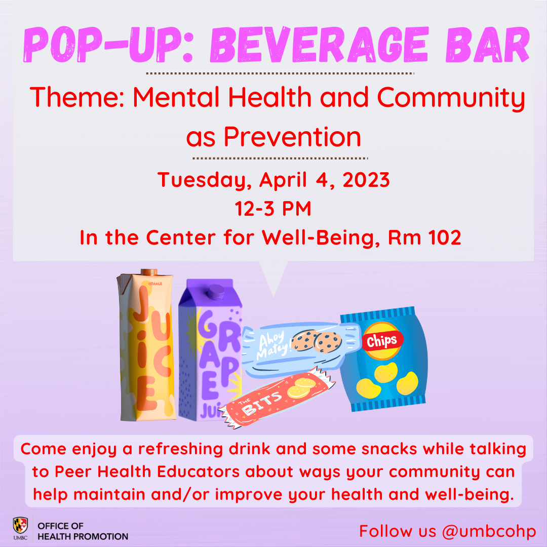 It’s time for our monthly Pop-Up Beverage Bar series! This month’s theme is community as prevention, so stop by the Office of Health Promotion to speak with our Peer Health Educators and learn about ways your community can help maintain and/or improve your health and well-being.