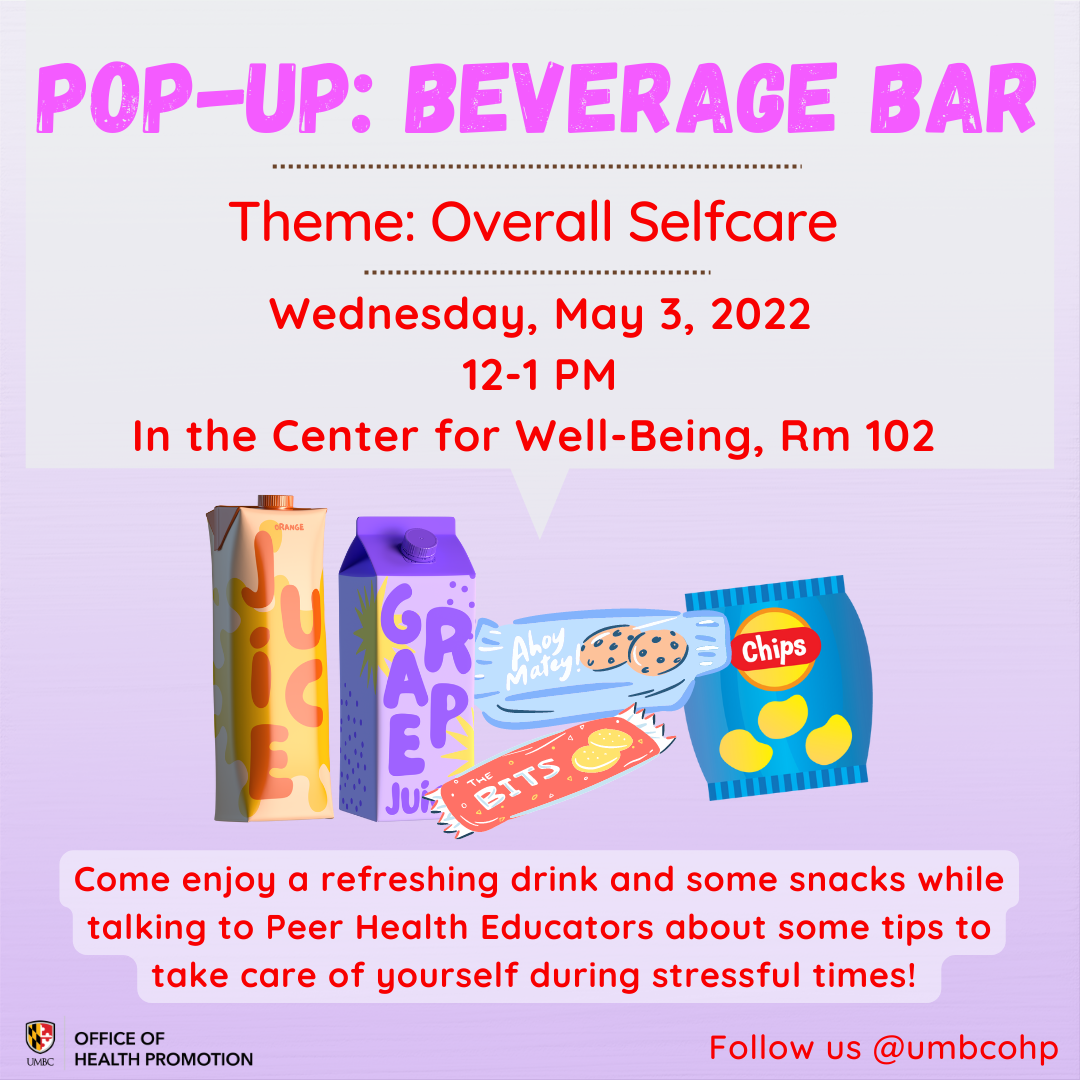 It’s time for our final Pop-Up Beverage Bar of the semester and this school year! It's finals week, so we are focusing on self-care. Stop by the Office of Health Promotion to speak with our Peer Health Educators and learn about some tips to take care of yourself during stressful times.