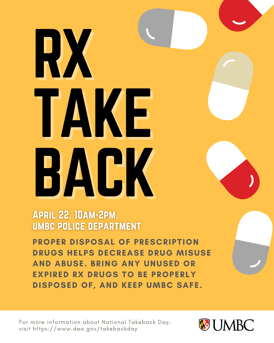 Drop by to learn more about how the UMBC Police can help your success and wellbeing this semester. UMBC Police will also be collecting expired prescription drugs for National Prescription Drug Take Back Day on April 22, 2023.