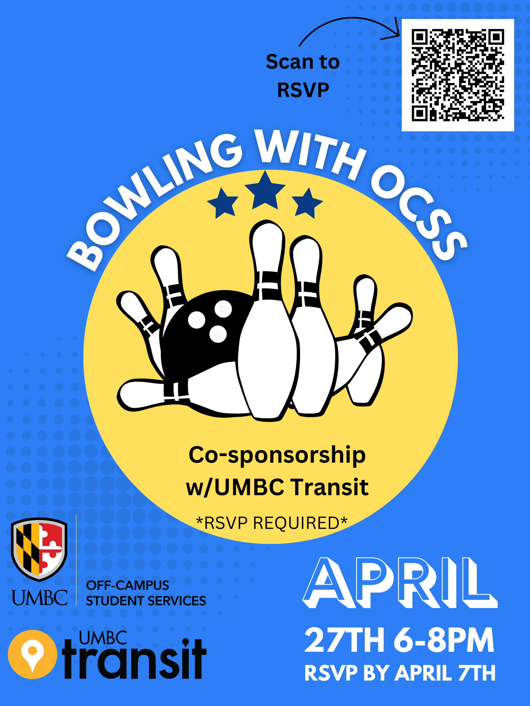 Get ready for an epic evening of strikes, spares, and good times with Off Campus Student Services! Mark your calendars for April 27th from 6 pm- 8 pm, when we'll be taking over the bowling alley at Bowlero Normandy in Ellicott City starting at 6pm. Hop on our shuttle (in partnership with UMBC Transit) or drive yourself to the party - either way, we can't wait to have you there!