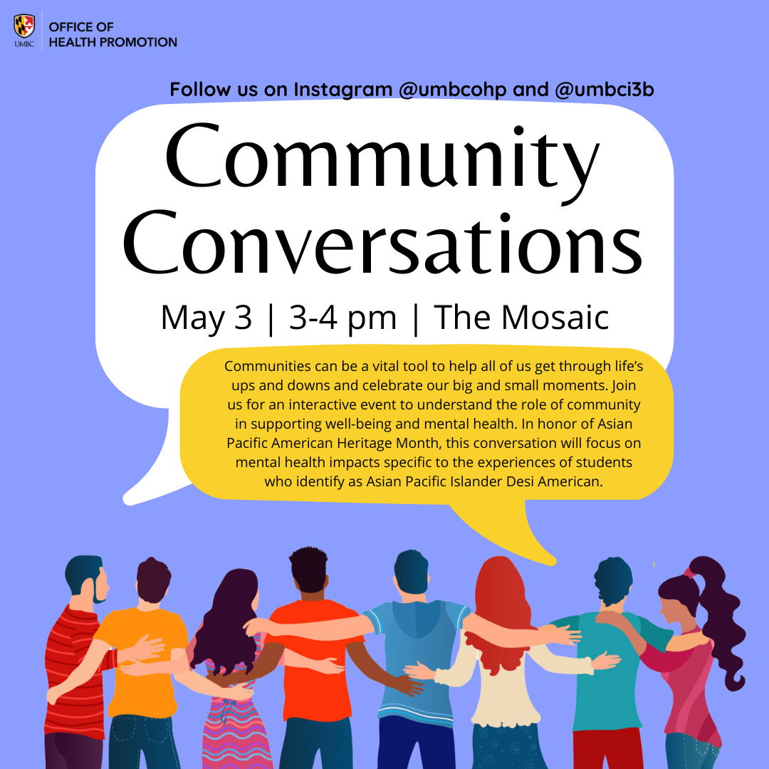 A community can be a vital tool to help all of us get through life’s ups and downs and celebrate our big and small moments. Community Conversations is an interactive event that will help students understand the role of community in supporting their well-being and mental health. This conversation will also highlight what it means to “show up” for others.