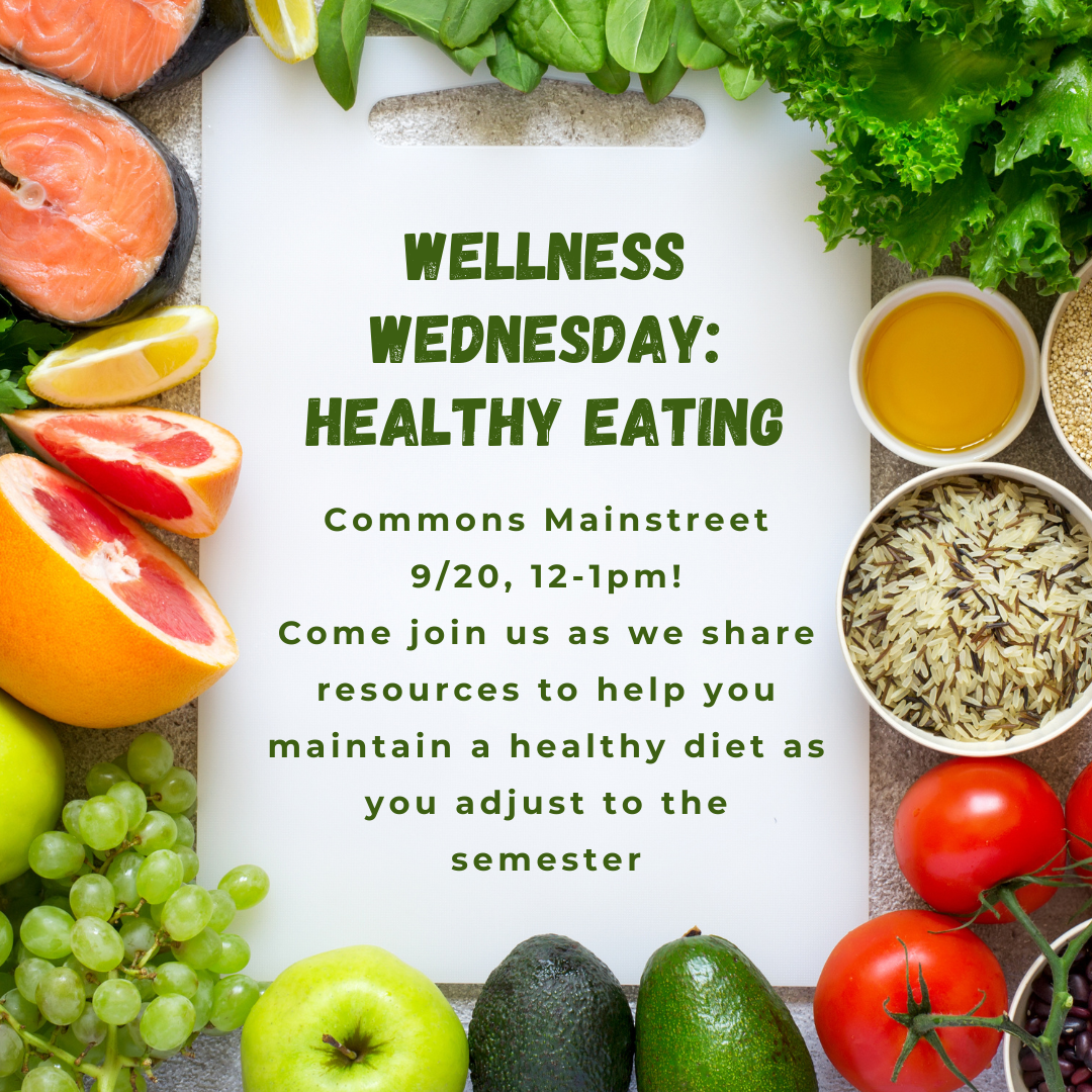 Join the Peer Health Educators for Wellness Wednesdays! This Wednesday stop by the Commons Mainstreet as we share resources to help you maintain a healthy diet as you adjust to the semester. Free recipe cards included!