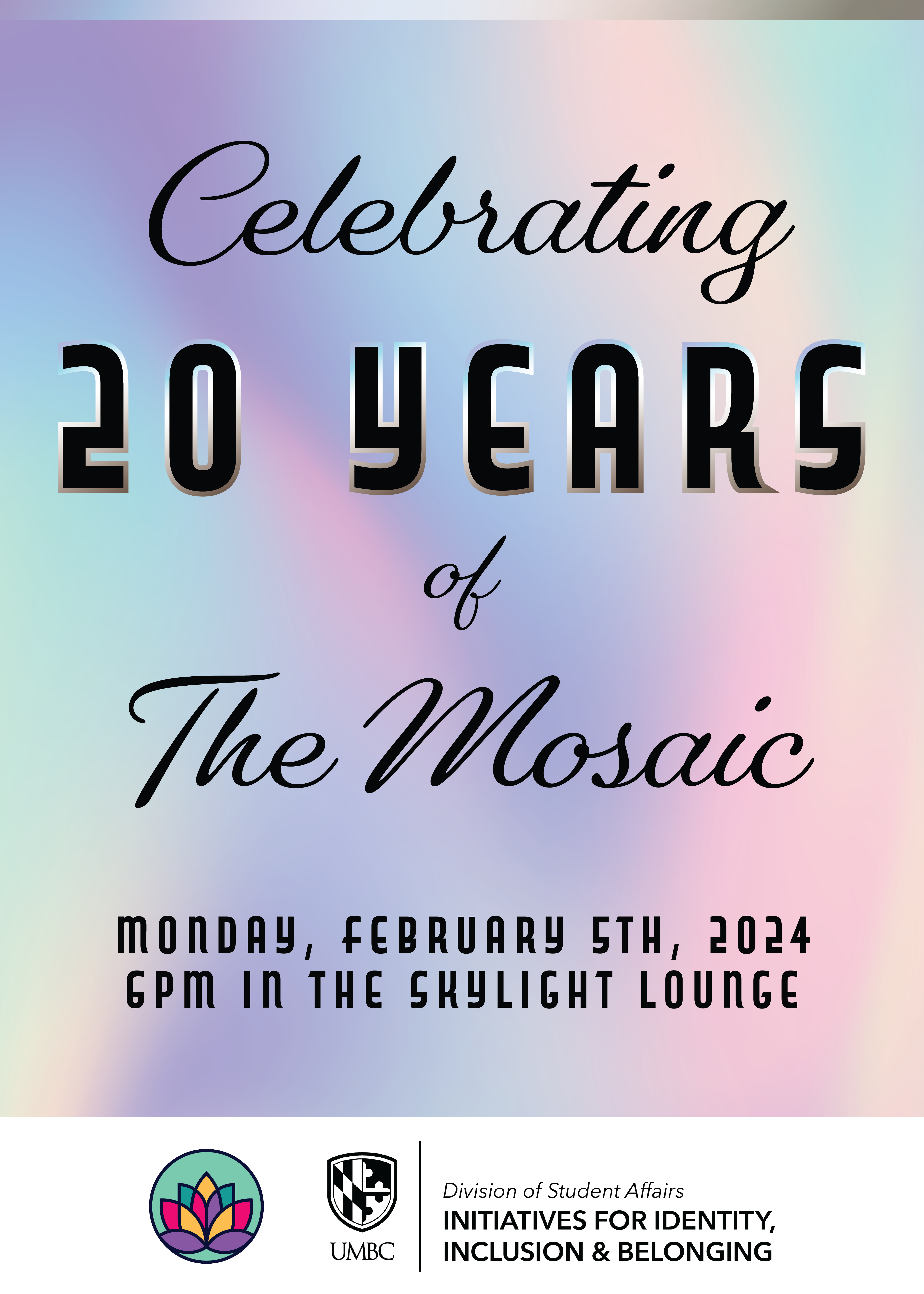 We invite you to join us for this evening celebration to honor and express our gratitude for the students, staff, faculty, alumni, and community partners who have supported The Mosaic for the last 20 years. We extend our appreciation to all who have been instrumental in creating an environment of cross-cultural education, celebration, awareness, and collaboration. This event is open to all. Please follow this link to RSVP. Hors-d’oeuvres, desserts, and light refreshments will be served. We look forward to celebrating 20 Years of The Mosaic together! Please see our myUMBC events post for more information.