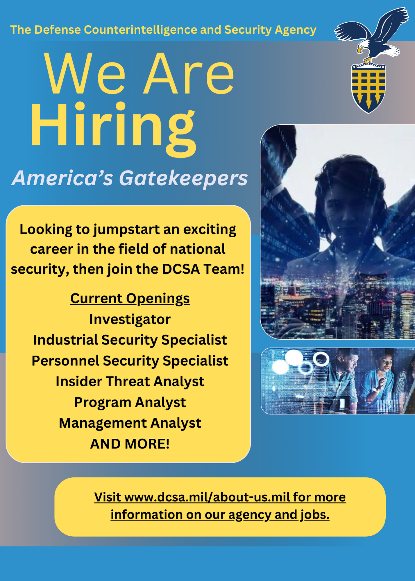 Please join the Virtual Information Session with the Defense Counterintelligence and Security Agency (DCSA) to explore and discuss more about open job opportunities.