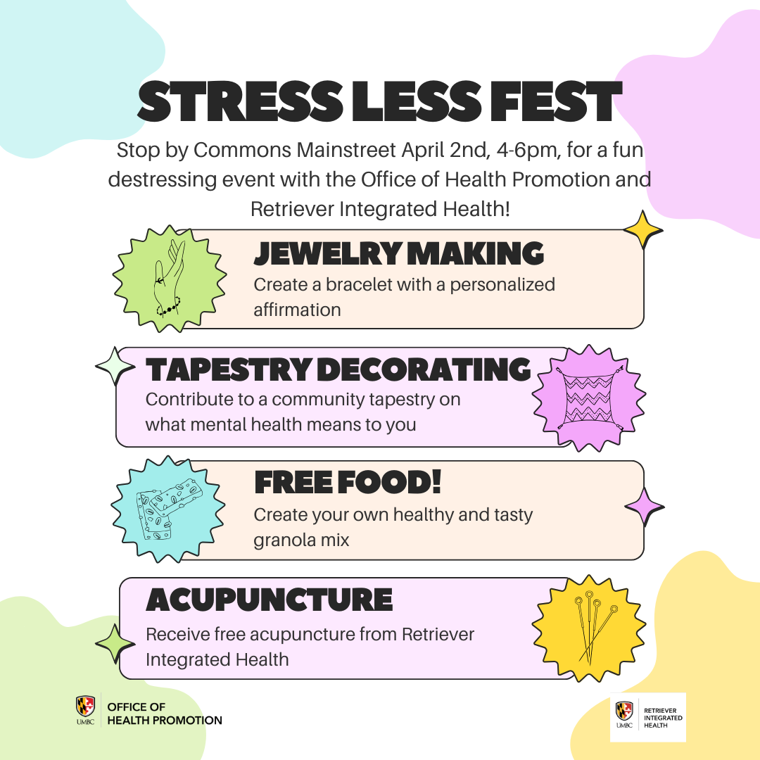 Join us and Retriever Integrated Health on Tuesday, April 2nd from 4 PM - 6 PM in The Commons on Mainstreet as we work on destressing half way through the semester by making jewelry, decorating a tapestry, and receiving free acupuncture. There will also be free food and a chance to win prizes!