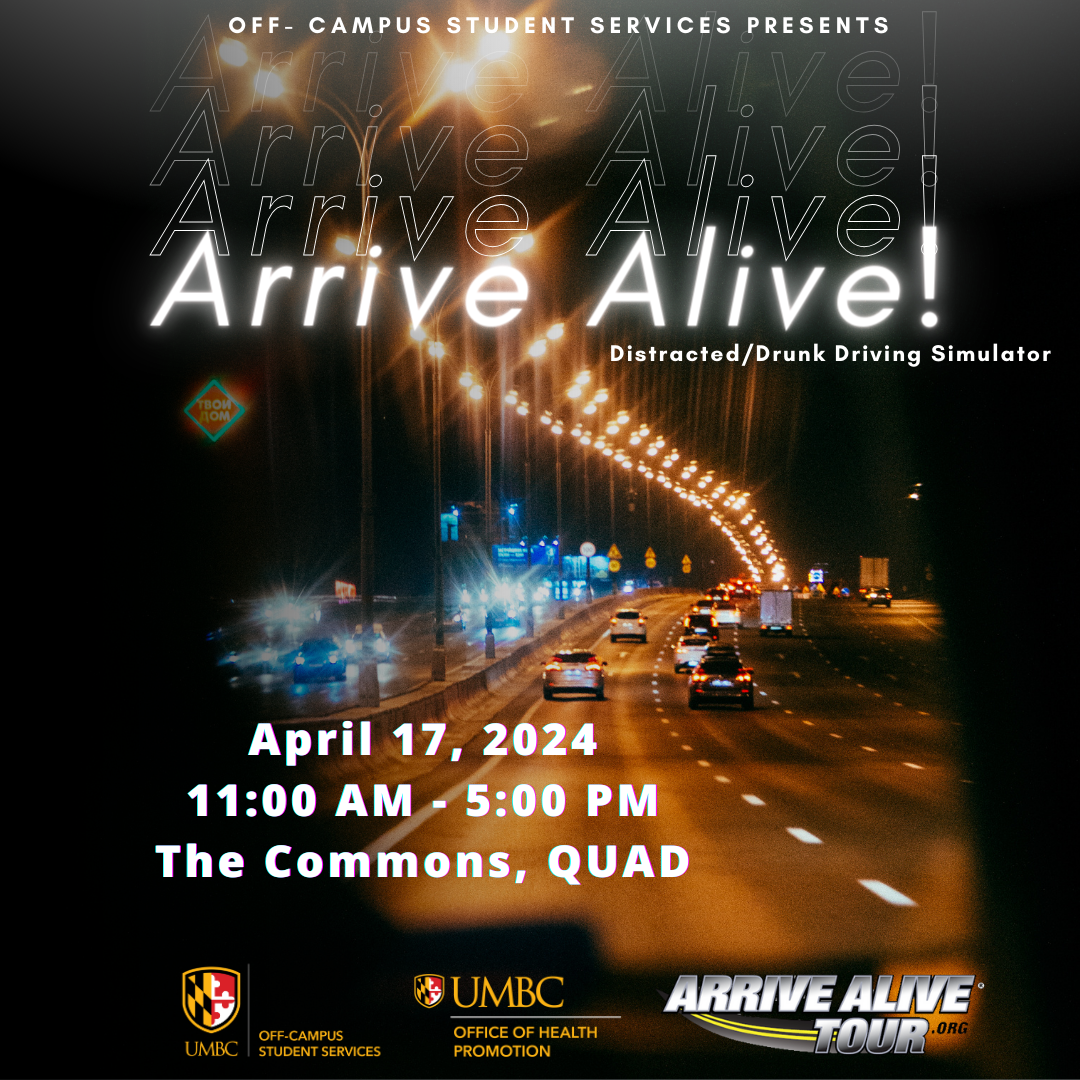 Join us and the Off-Campus Students Services on Wednesday, April 17th from 11:00 AM-5:00PM on the Quad as we promote safe driving with the Arrive Alive Tour! There will be a distracted/drunk driving simulator available for students to participate in.