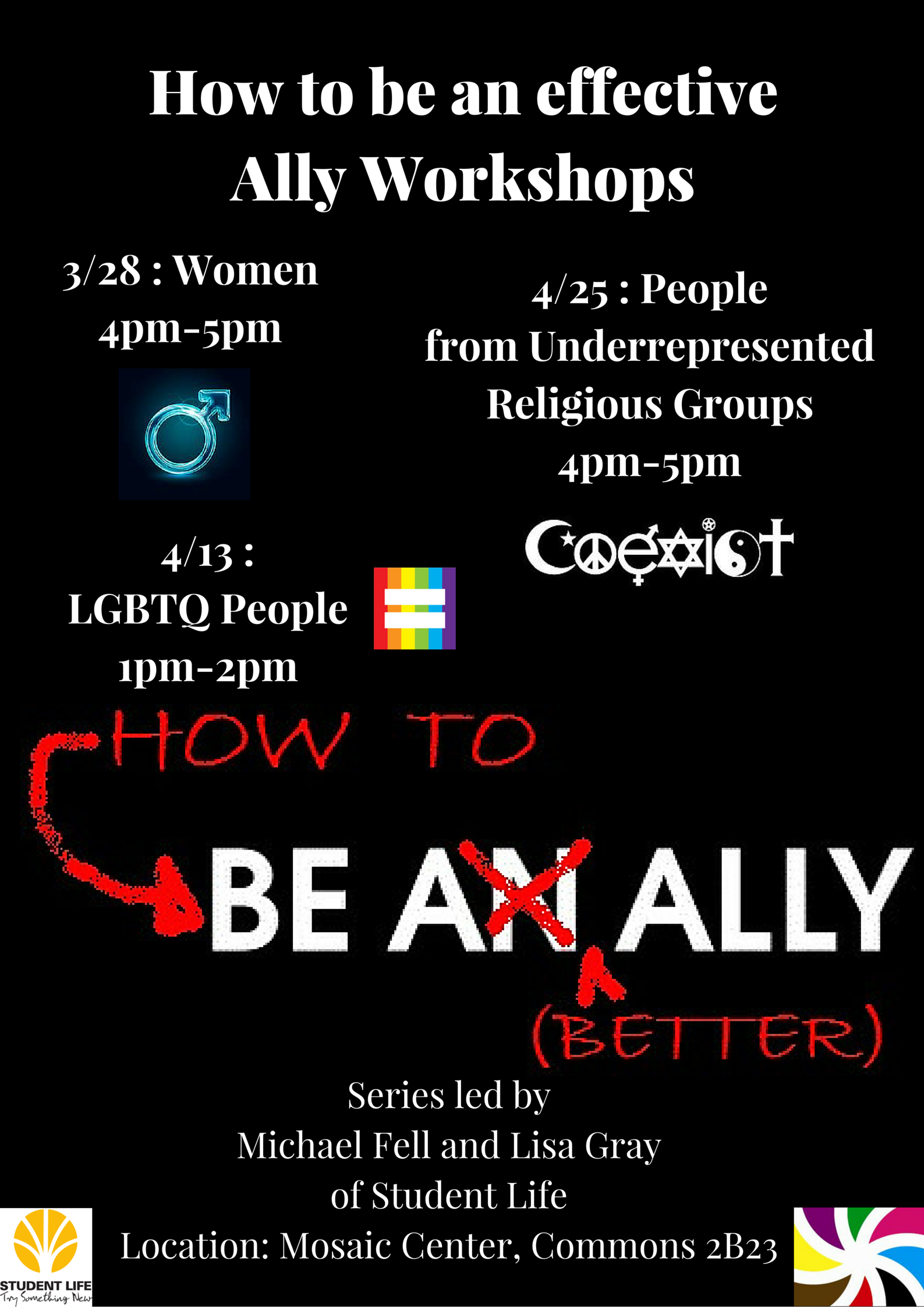 Then, join us for our new How to be an Effective Ally workshop series! Get practical tips and strategies for supporting and advocating for your friends colleagues. All UMBC students, staff and faculty are welcome to participate.
